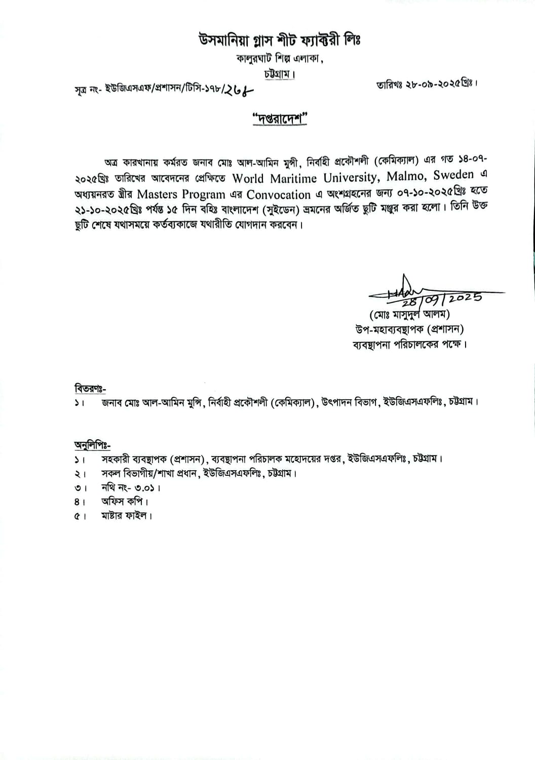 Md. Al Amin Munshi, Executive Engineer, ex Bangladesh leave 05-Oct-25